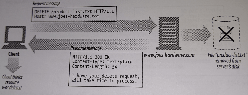 When you want to remove specific file from Webserver, you can send DELETE Method/Request to Webserver specifing file. In real world on some website, you are given option to delete some file which is nothing but delete file with DELETE Method of HTTP Protocol. Here in Image Client(Web Browser) send DELETE request with filename product-list.txt to Webserver www.joes-hardware.com and Webserver process this request and delete file product-list.txt from disk. To confirm delete webserver send response to Web browser with 200 OK reply.