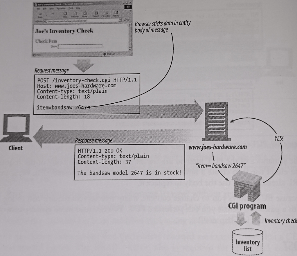 In Image browser send POST Request to page joes-hardware.com/inventory-check.cgi with form values item=bandsaw 2647 and Webserver pass values to CGI program inventory-check.cgi which is nothing but web program which run on webserver. This inventory-check.cgi check database Inventory list for availablity of bandsaw type 2647 and reply back to webserver and webserver send reponse to client(web browser)