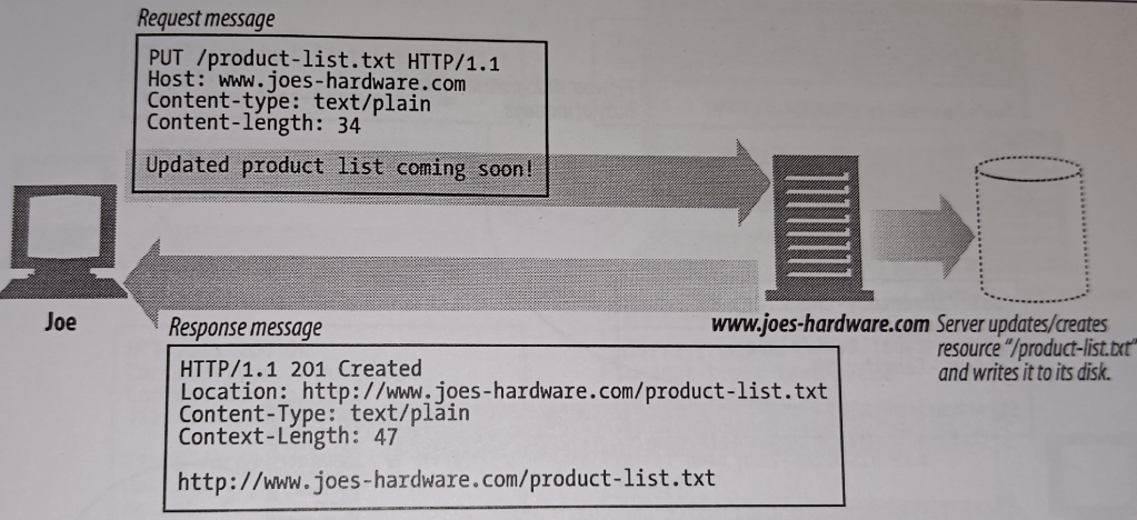 When you want to save/upload file on Webserver that time PUT Method use. Here Joe/Client/Web browser send request to upload file product-list.txt on server using PUT Method. Now, Web server process PUT request and save file on disk and send response to Web browser with confirmation HTTP/1.1 201 Created